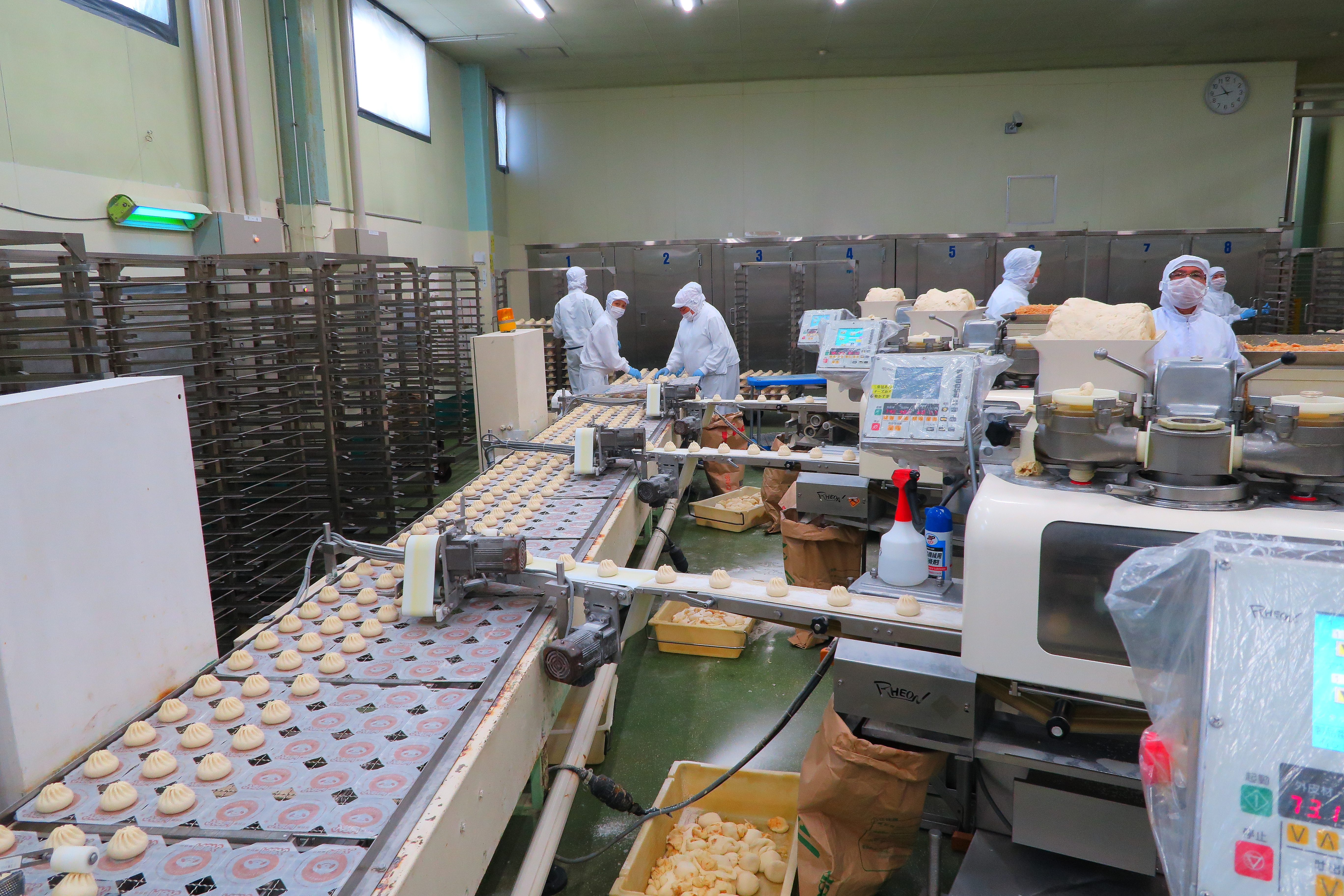 井村屋の肉まん、あんまん、カレーまん、ピザまんの「調合」「包あん」「蒸し」「包装」及び氷みつの「調合」「充填」「殺菌」「包装」の各工程を行っています。